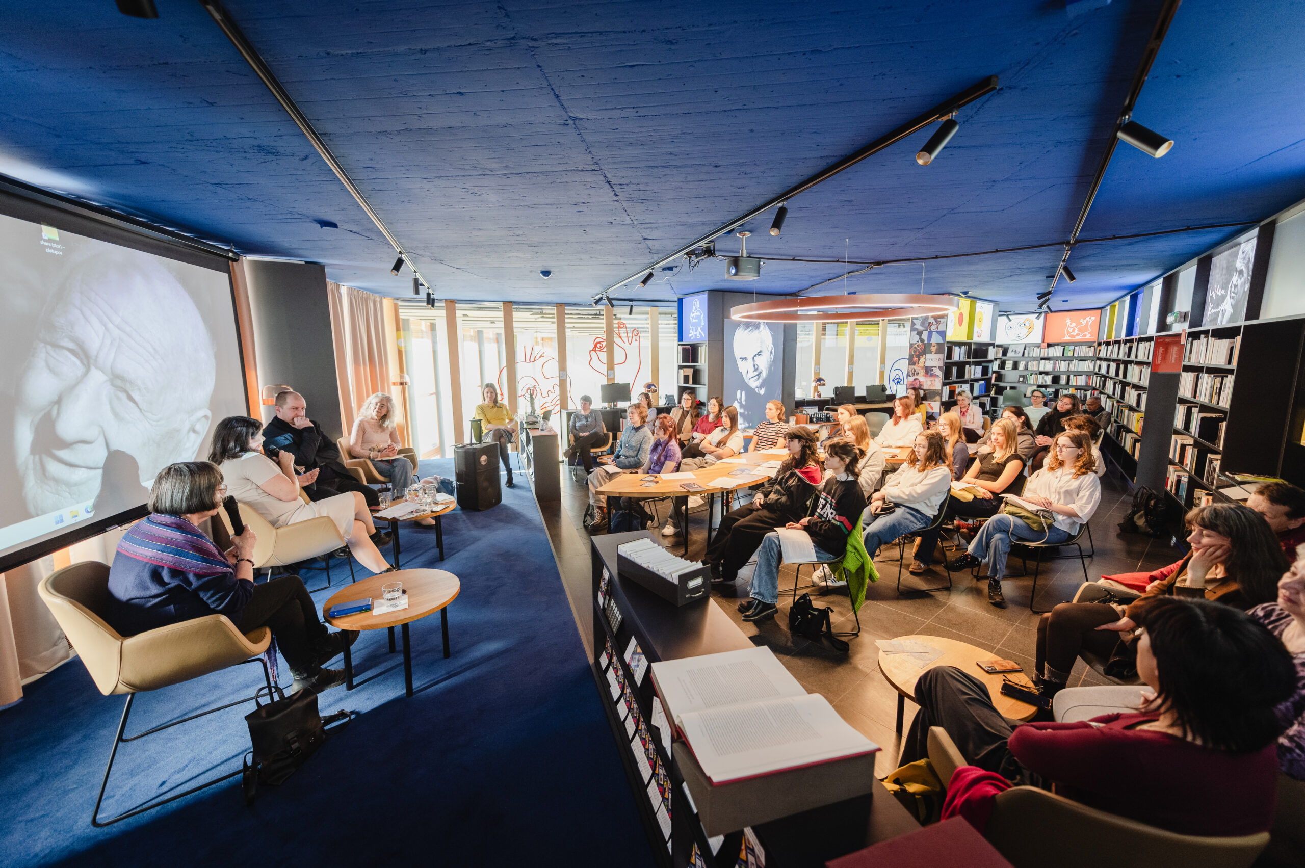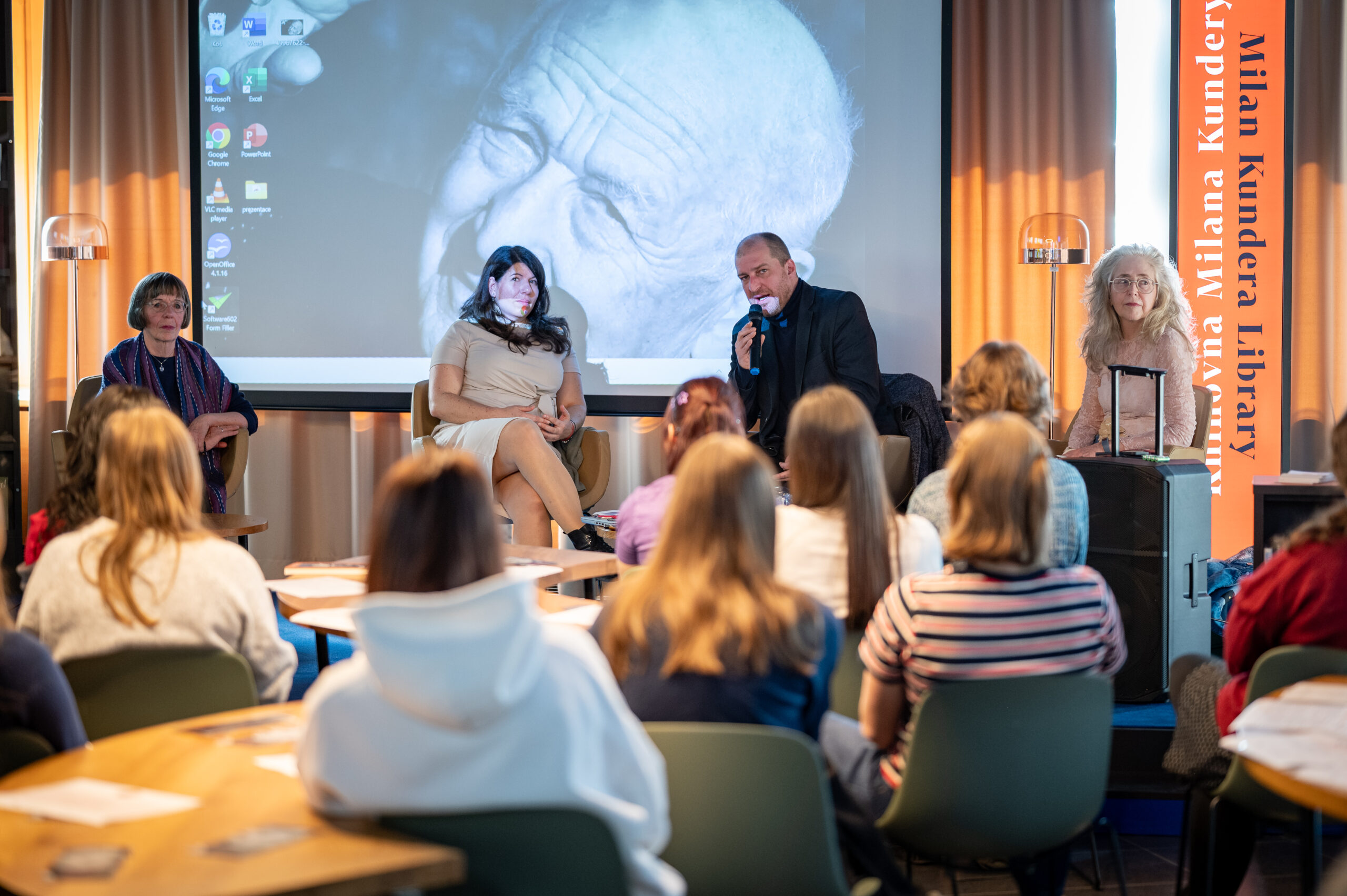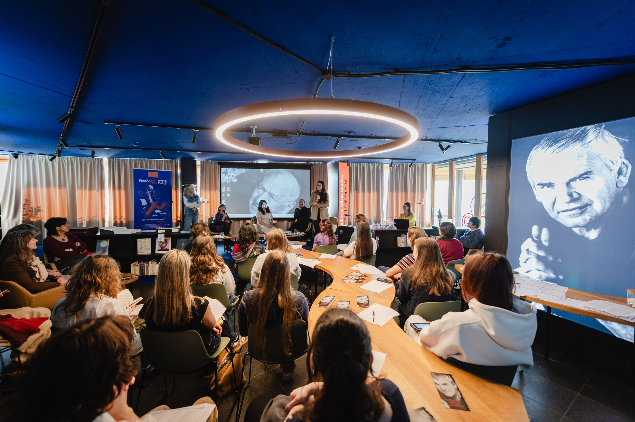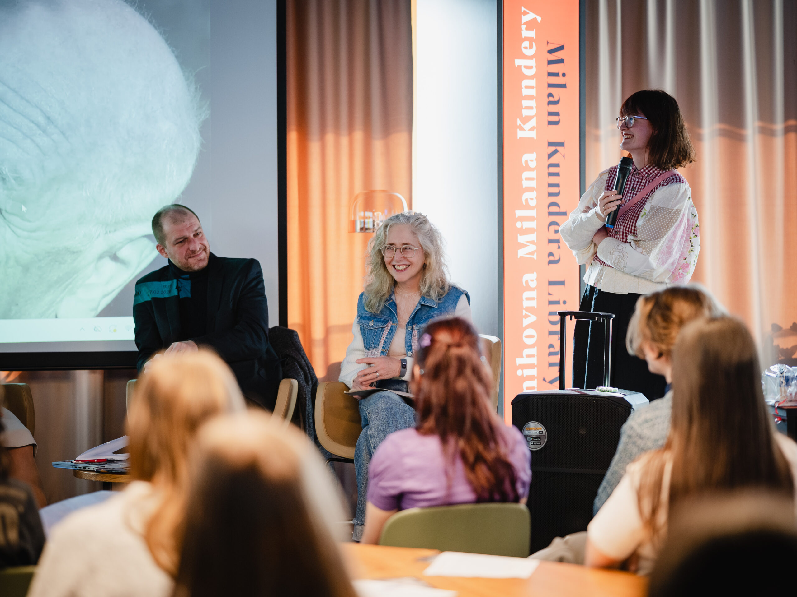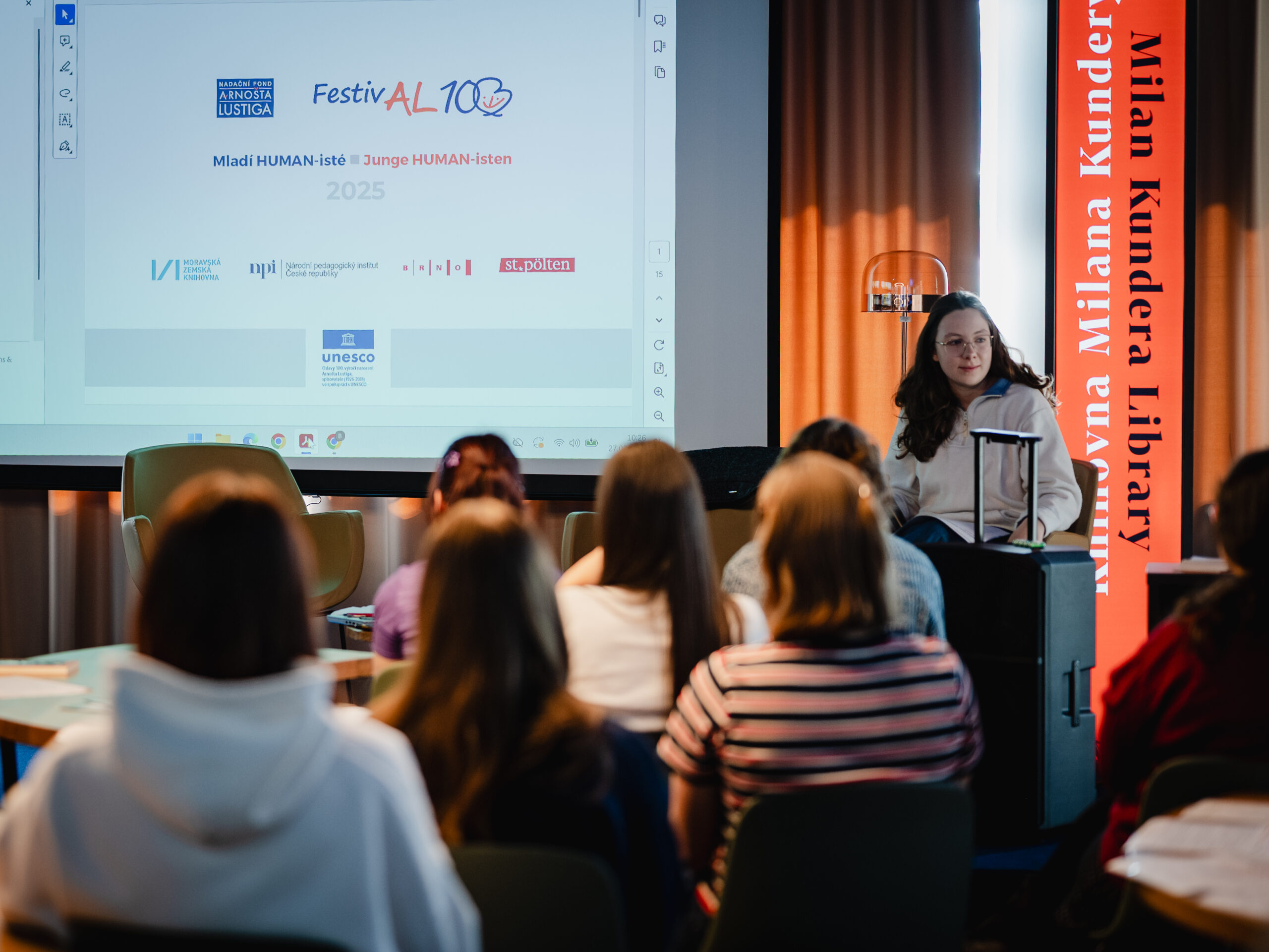 Autoři a autorky oceněných literárních příspěvků soutěže Mladí HUMAN-isté ze středních škol v Brně, St. Pöltenu a Vídni se zúčastnili besedy s překladatelem a tvůrcem Ondřejem Cikánem. Beseda proběhla v Knihovně Milana Kundery ve spolupráci s Národním pedagogickým institutem, Moravskou zemskou knihovnou, městem Brnem a městem St. Pölten. Foto: Jakub Šnajdr