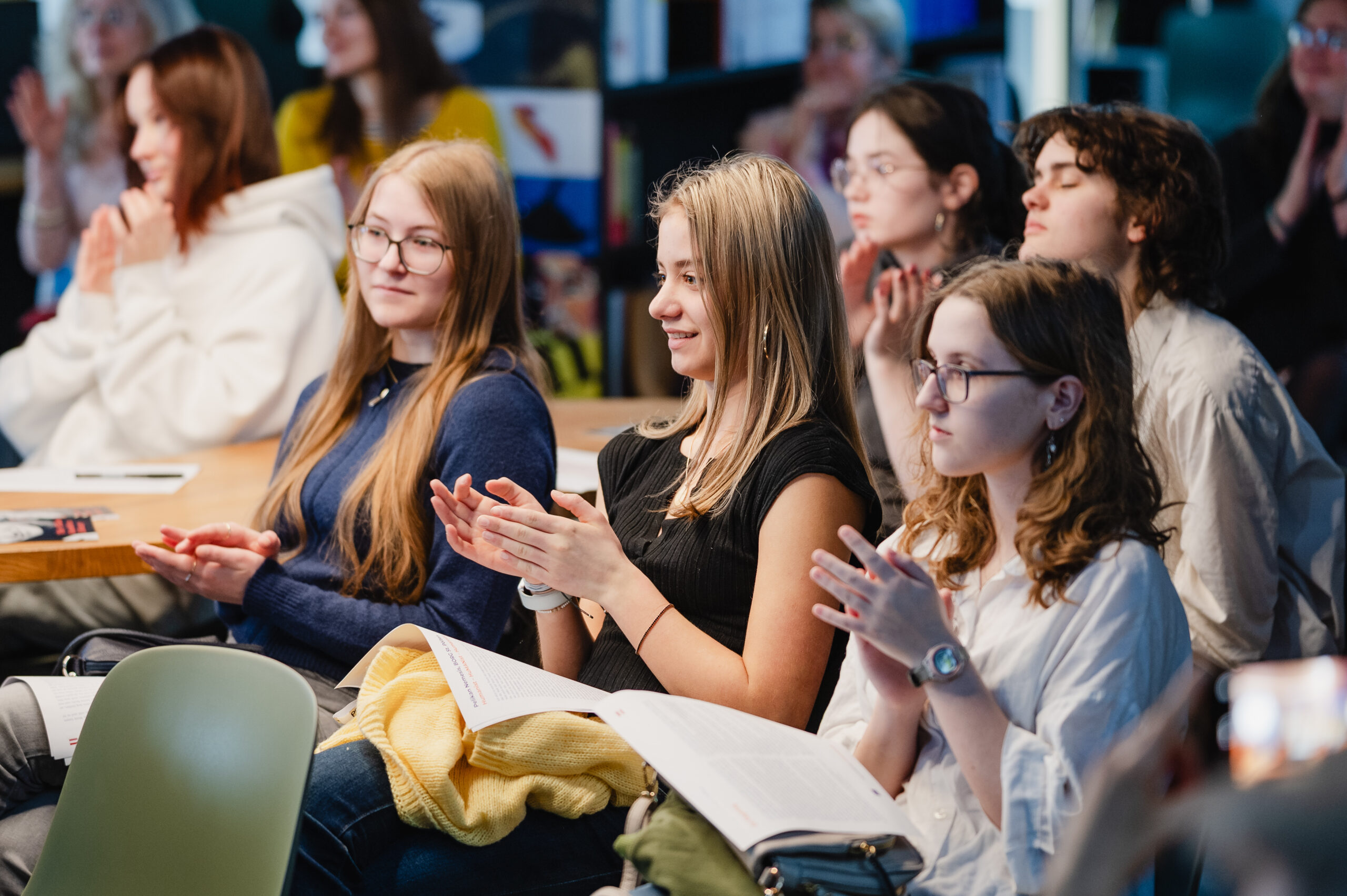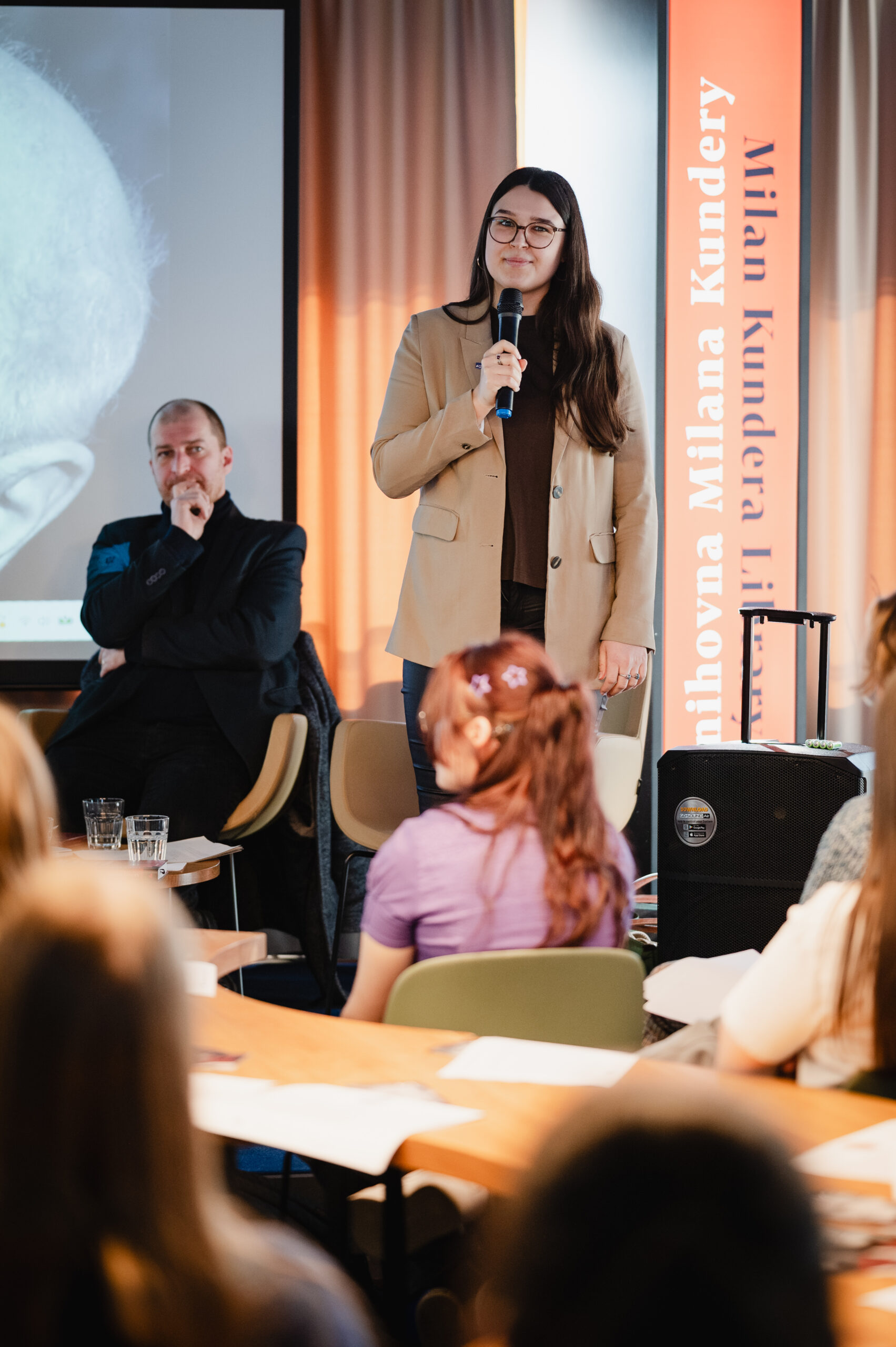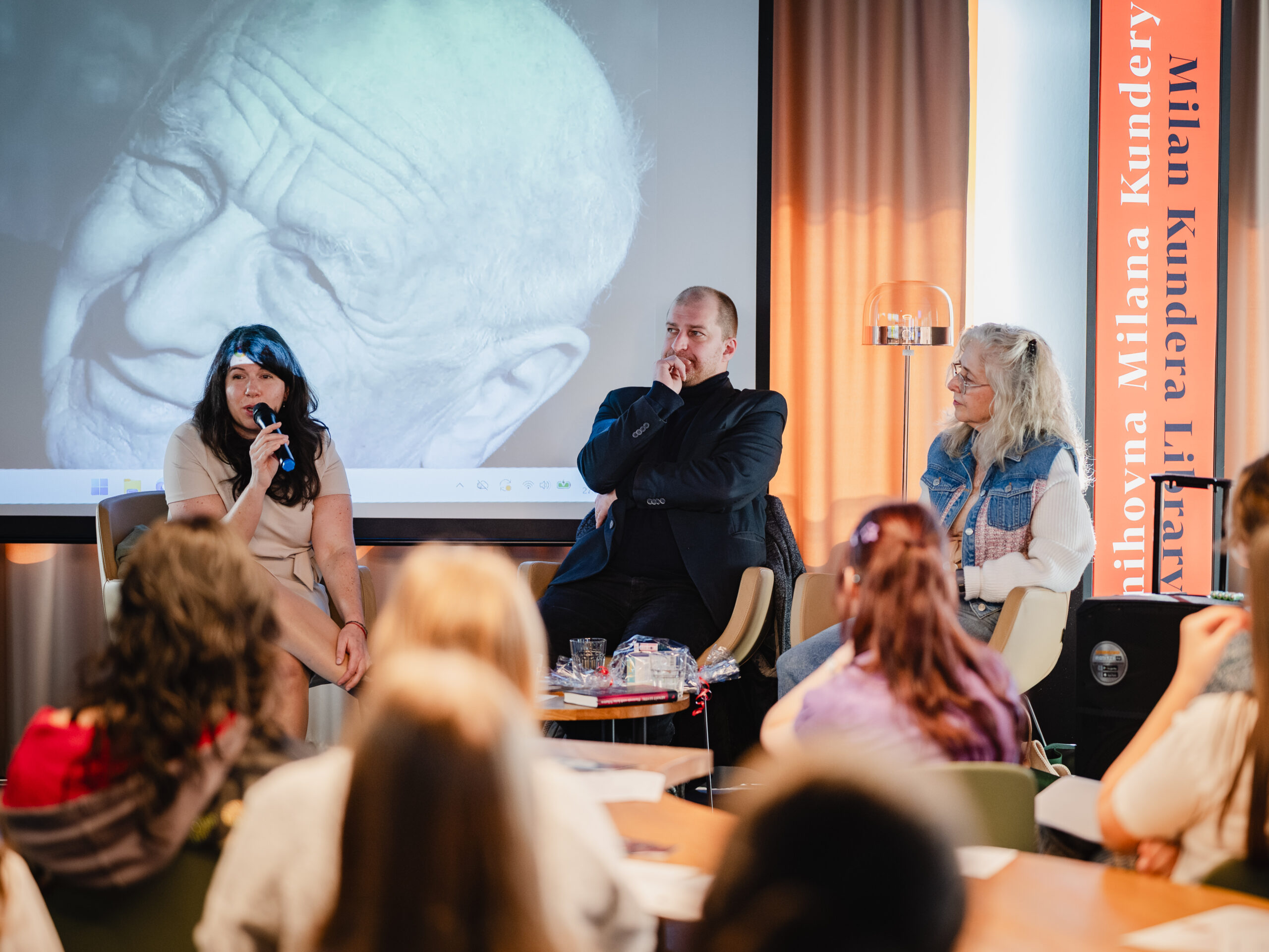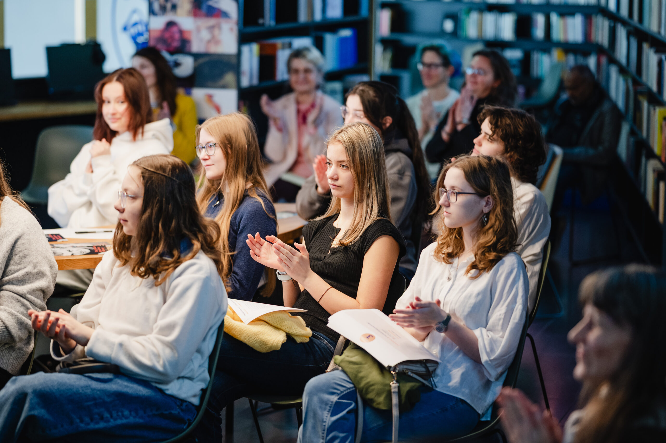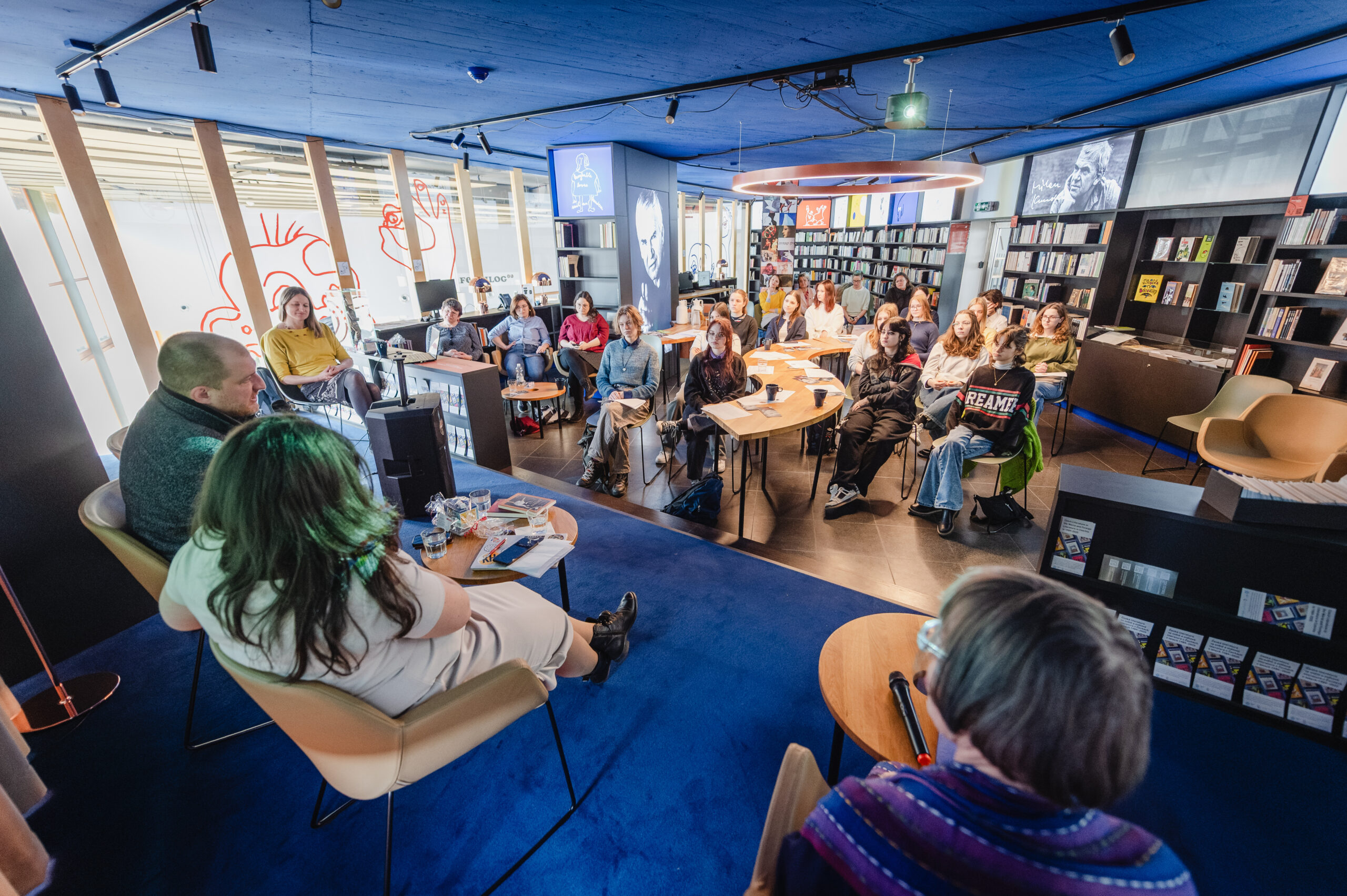 Autoři a autorky oceněných literárních příspěvků soutěže Mladí HUMAN-isté ze středních škol v Brně, St. Pöltenu a Vídni se zúčastnili besedy s překladatelem a tvůrcem Ondřejem Cikánem. Beseda proběhla v Knihovně Milana Kundery ve spolupráci s Národním pedagogickým institutem, Moravskou zemskou knihovnou, městem Brnem a městem St. Pölten. Foto: Jakub Šnajdr